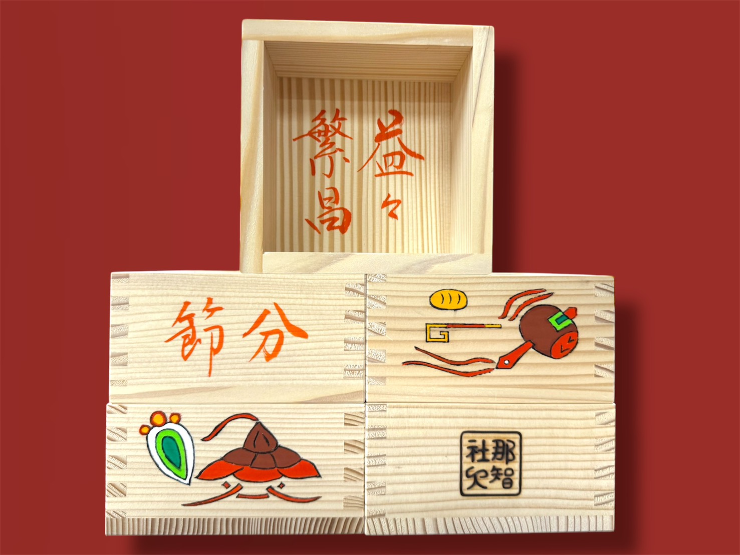 枡には「富貴」を祈念する縁起物が描かれているほか,内側には「益々繁盛」と記されています